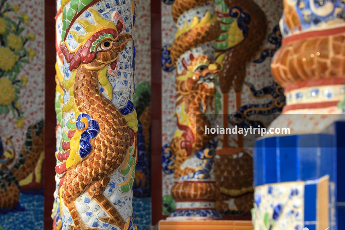Located in sand dunes between the village and the coast, on a super long barrier island between Tam Giang Cau Hai lagoon system and the sea, An Bang Cemetery spans up to 40 hectares. This is home to thousands of small and big tombs where people from different generations of An Bang village are buried. Today, it becomes famous across Vietnam due to its richly decorated and expensive buildings. The biggest tombs boast a Hue local architecture with beautiful and colorful ceramic mosaics (that may be inspired by Khai Dinh Tomb, the mausoleum of the 12nd Nguyen king). The artisan has to cut or break ceramic pots, vases, plates, cups,… to have small pieces and then use hands to create amazing art works on tomb’s walls. Holy animals and plants with different meanings, are also used to make mosaics more lively.