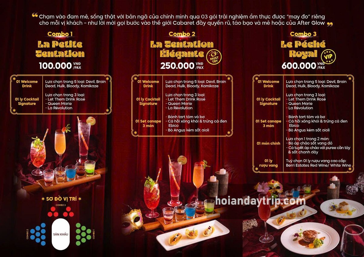 + combo 1 (LA PETITE TENTATION): costing 100,000 VND, including 1 welcome drink and 1 cocktail (please see the menu below)