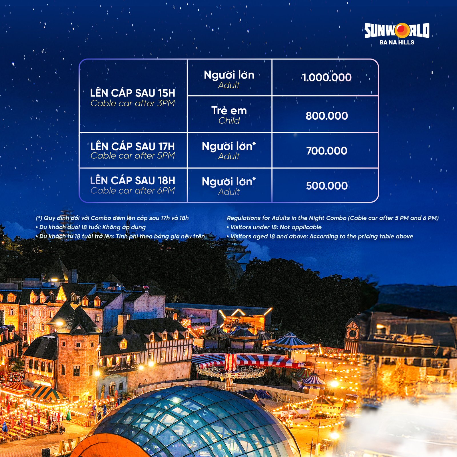 From 3:00 to 6:00 pm (or 4:00 to 6:00 pm), the price of Ba Na Hills night ticket will be 1,000,000 VND for adult and children above 1,39 meters and 800,000 VND for children from 1 meter to 1,39 meters. It’s free of charge for children under 1 meter.