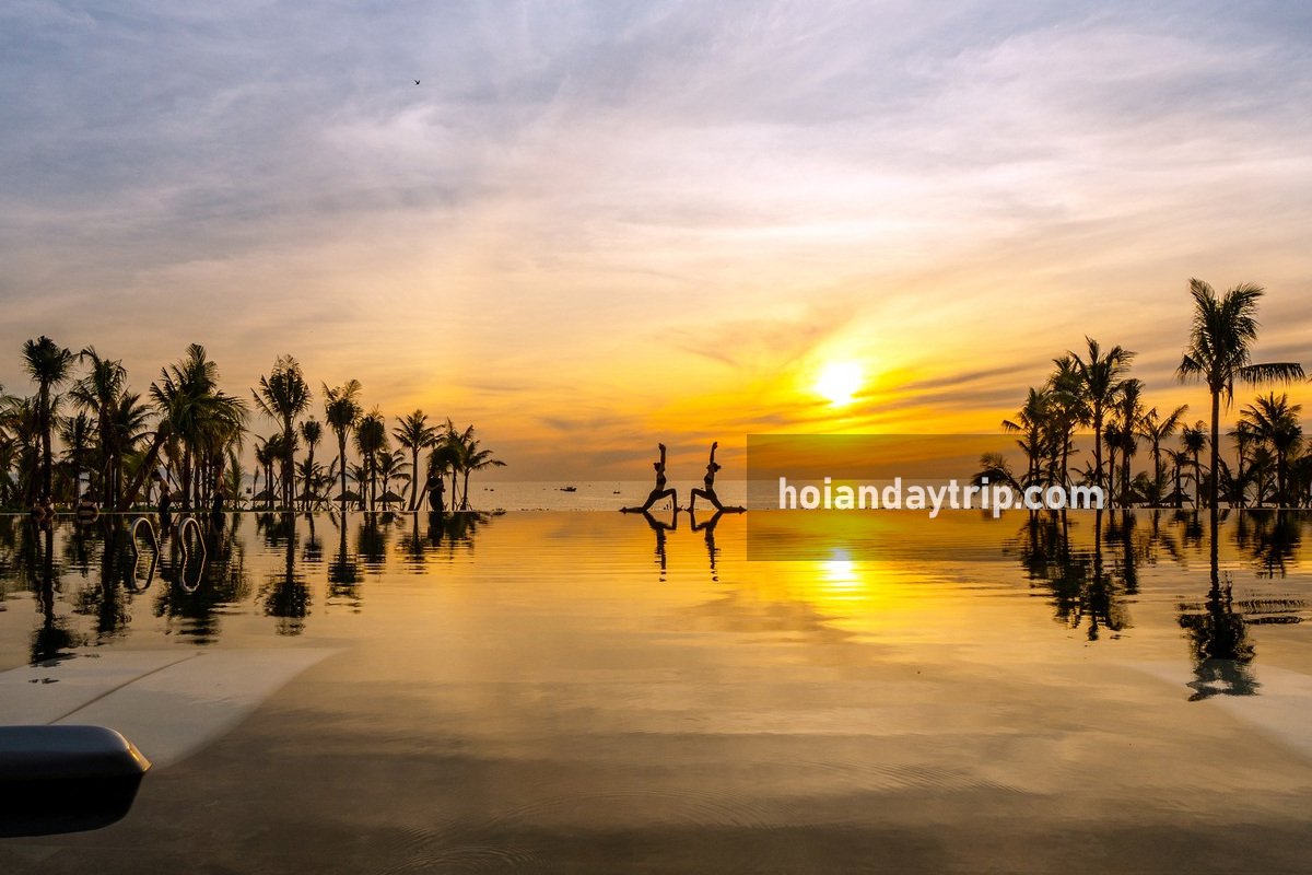 Binh Minh Beach is one of the most beautiful beaches in Hoi An Vietnam. This beach is about 1 kilometer long, and famous for an unspoiled stretch of soft sand by crystal clear and not deep water. Waves here are not strong throughout the dry season. The view to mountains and islands of Cham Islands is just stunning. Within hotel/resort, sure it’s easy to find sun loungers or hammocks to lie down and relax. Compared to other famous beaches in Hoi An – An Bang Beach and Cua Dai Beach, it’s much more peaceful here.