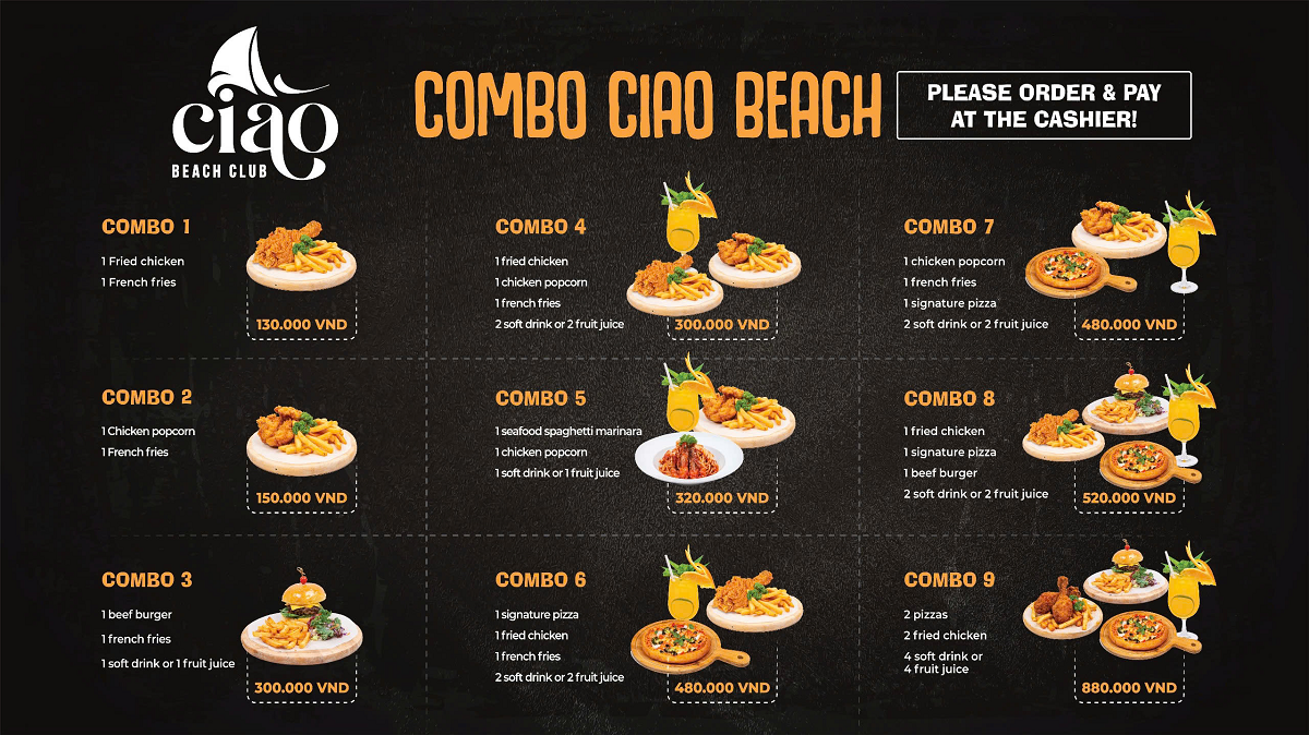 There is one restaurant-bar at Ciao Beach to eat and drink. It’s called ‘Ciao Beach Club’. Here visitors will see chicken and French fries, pizza (signature, Napoli, Pasto), spaghetti (Bolognese, tomato sauce, seafood), burgers (beef, chicken, mushroom), fresh juices, soft drinks and of course, Sun craft beer. The price starts from 70,000 VND. See full menu below.