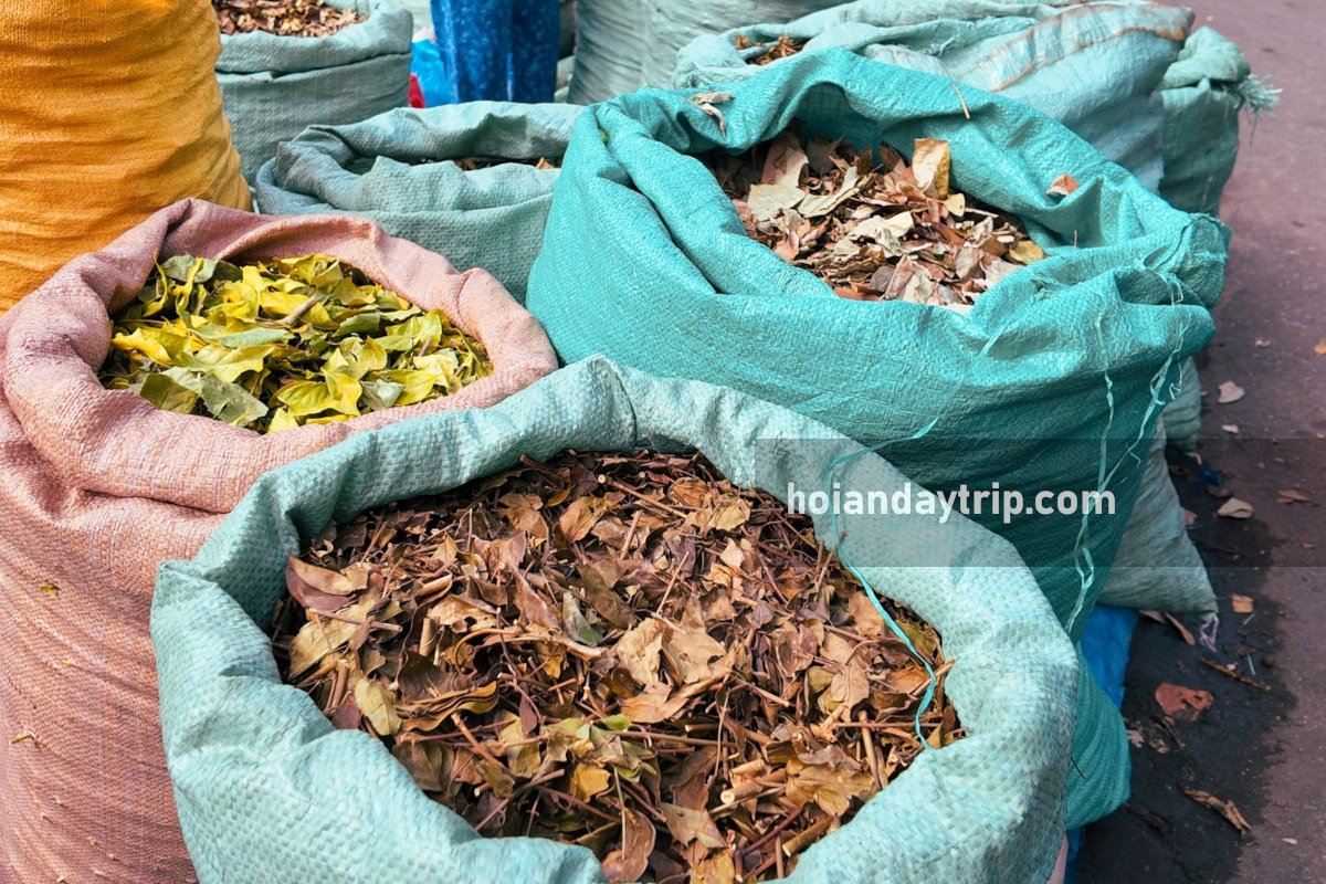 + herbal tea made by la mung nam (the fifth day leaf): a potent blend of dozens of wild herbs and roots believed to reach their peak medicinal power at exactly noon on the festival day. This earthy, slightly bitter tea is consumed to detoxify the liver and improve digestion, serving as a natural remedy to “kill pests” and protect the body during the transition into the summer heat. Before the festival, visitors can come to entrance of Hoi An Central Market to buy the leaves.