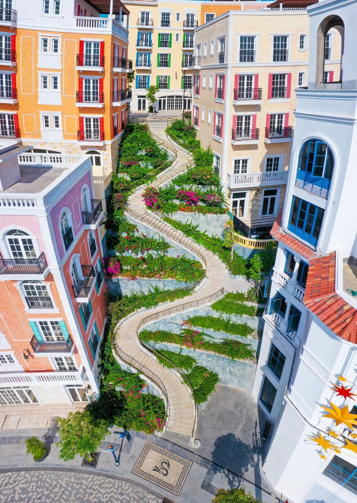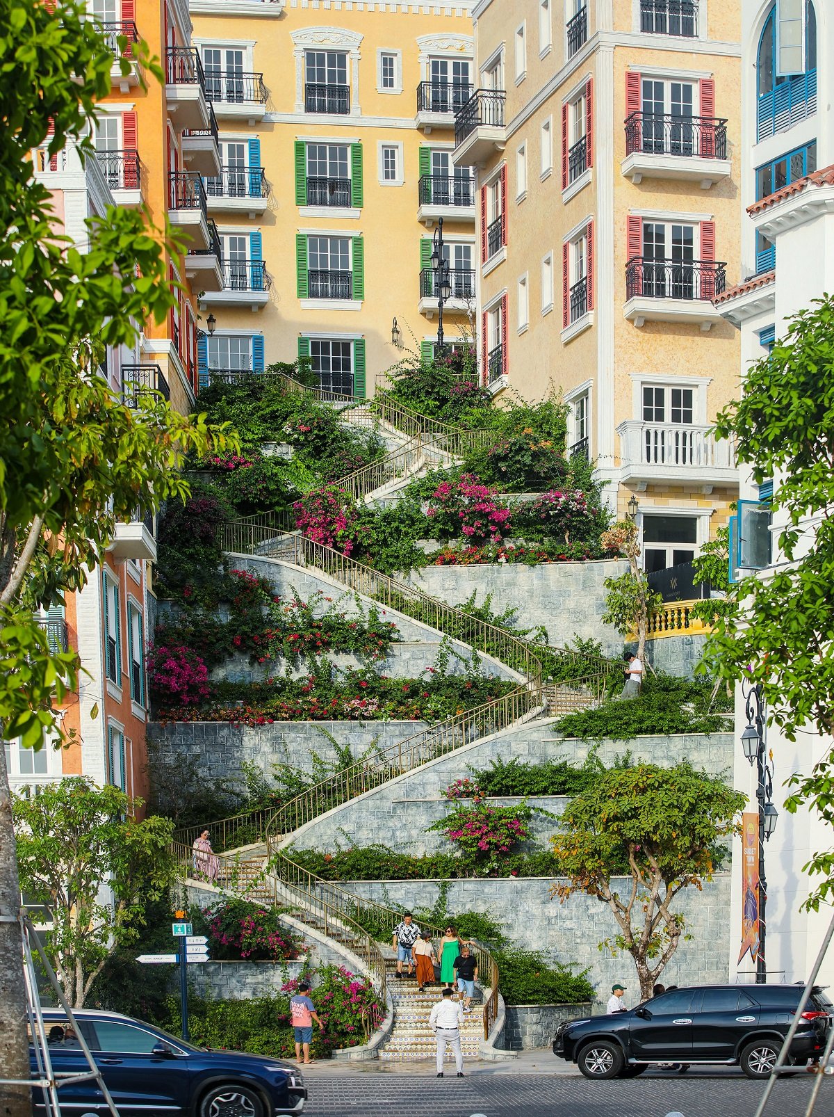 On the other side of Amalfi Road from Le Festa Square, the Dragon Stairs (Thang Rong) is a popular Instagrammable spot in Sunset Town Phu Quoc. It’s well known for colorful, flower-filled, steep and winding stairs descending from Milan Road (or from east to west), with 4 hairpin turns. Its style is inspired by Lombard Street in San Francisco city in the United States, the crookedest street in the world and built in 1922. Today, the stairs are decorated with red and/or white bougainvillea.