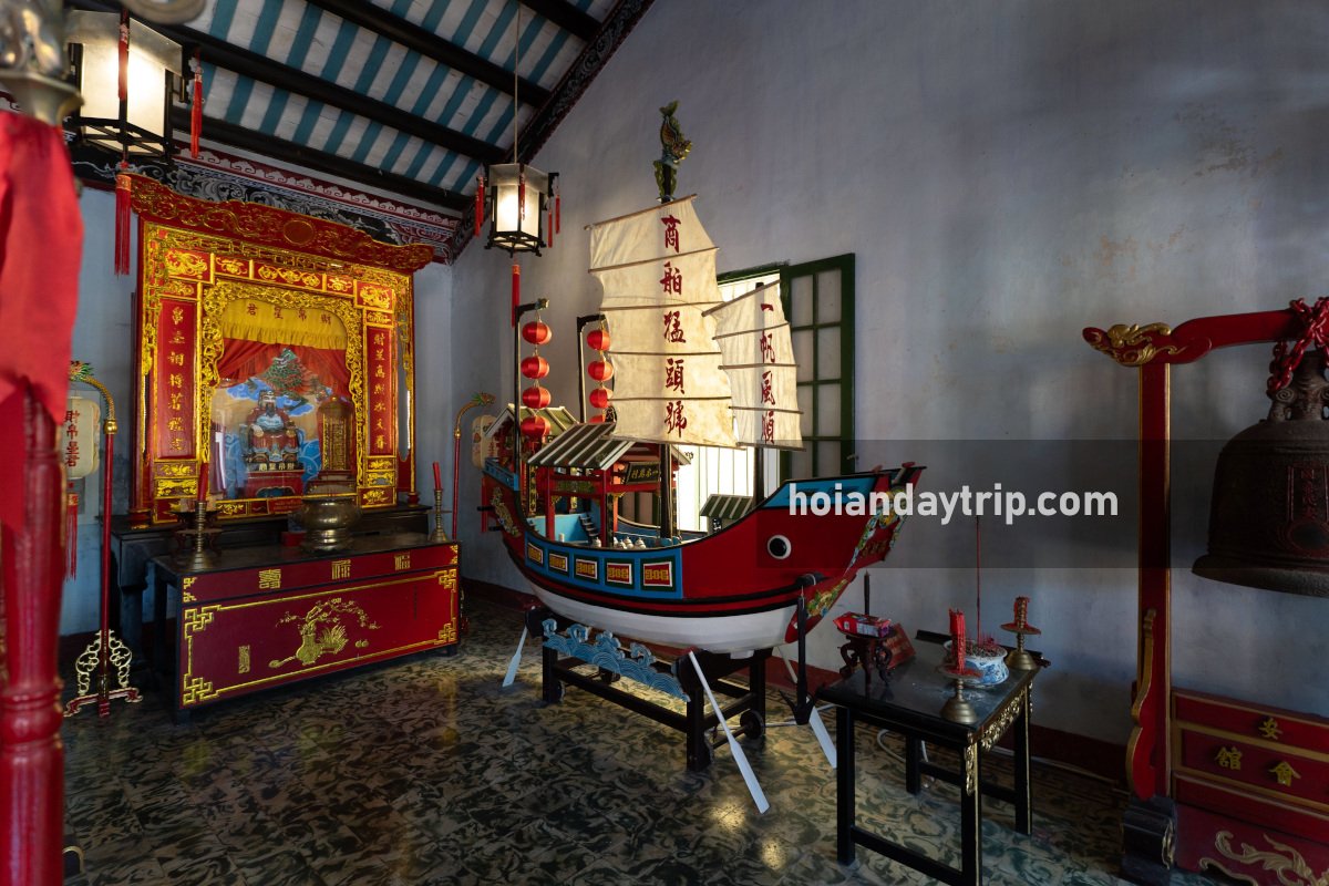 On the other side of the yard, there is the main worshipping hall. It has a pavilion in the front, featuring four pillars and two tile roofs. Here, visitors can find a couple of chairs to have a seat and wait for the turn to go in the worshipping room to pray. Inwards, tablets of the 108 Hainan Brothers are seen, between the God of Wealth (left) and ancestors of the community (right). In the front, there is a wooden pedestal with exquisite carvings portraying life in three realms (heaven, earth, underwater), animals and plants. This is one proof showing the high level of workmanship of carpenters from Kim Bong Village, Hoi An. Like other Chinese assembly halls, a model of a red wooden boat is also seen in the room.