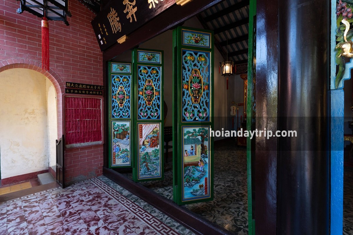 The main entrance building of the Hainan Assembly Hall is unlike other Chinese assembly halls in Hoi An. In common, it has three doors but here, only the middle door is kept, and two others are ‘moved’ to the front and at the sides. For that reason, visitors will need to walk through two gates to enter the assembly hall. Above the middle door, the board has 4 Chinese words meaning ‘Assembly Hall of Chinese Hainan Congregation’.