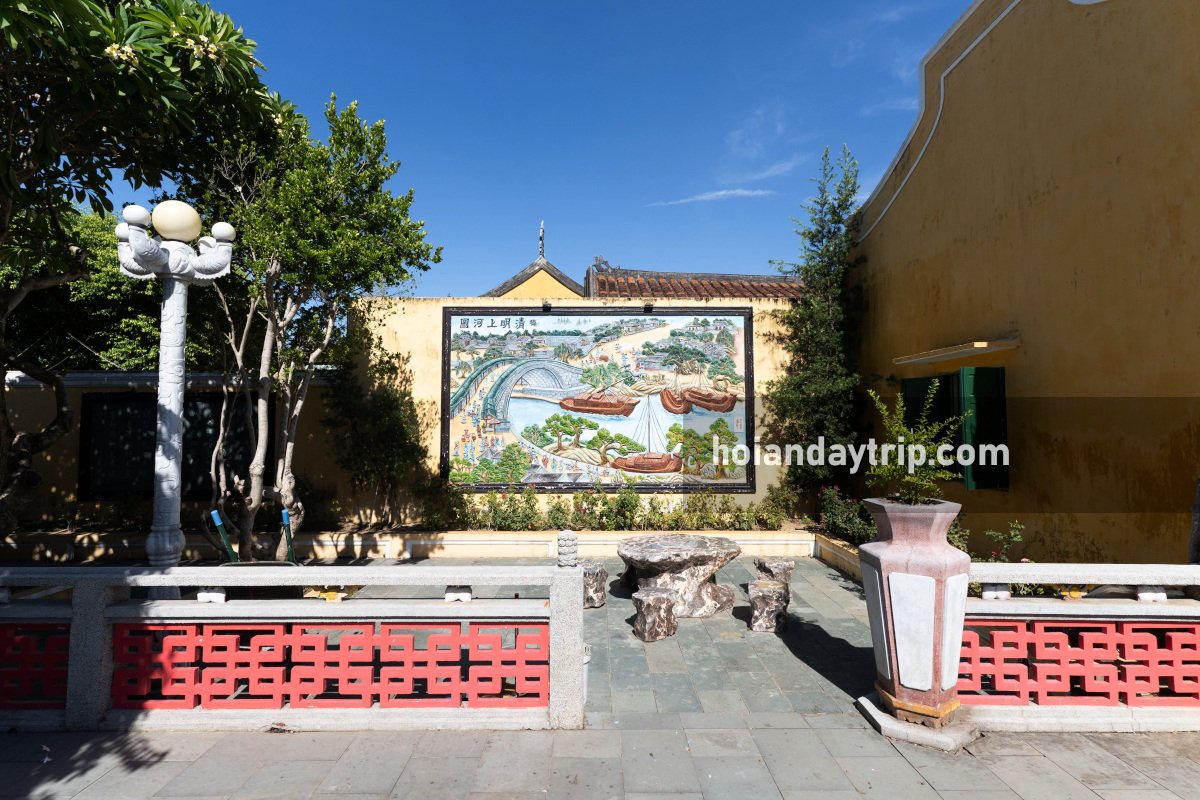 On the wall to the right, there is a painting portraying the harbour scene near the Hainan Assembly Hall at Hoi An. On the river, sailing boats come with goods and people walk and work along streets, showing the vibrancy of Hoi An in the past.