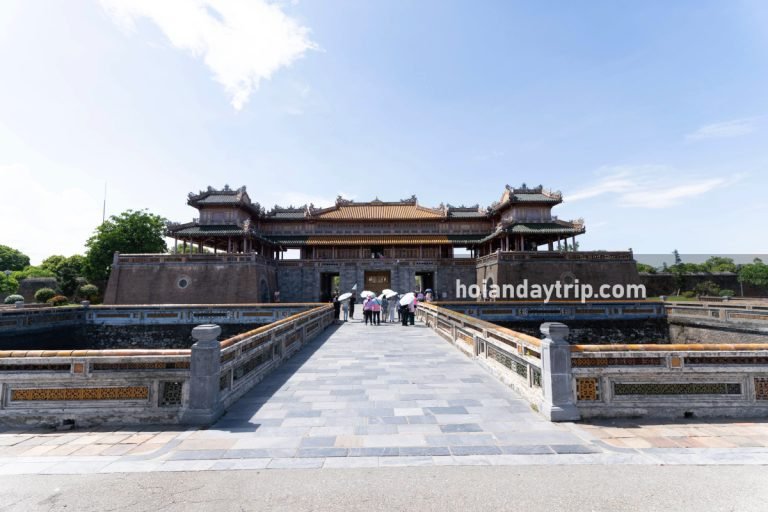 Ngo Mon Gate: the south gate and the largest gate of the Imperial City. It’s built in 1833, with a U-shaped base and a magnificent wooden pavilion on it. Today, this building is the symbol of Hue city. In the front, there are a square and a huge flag tower. See more details