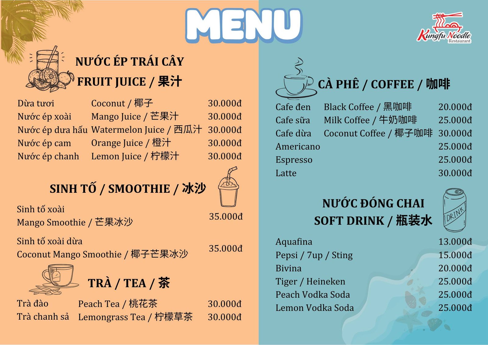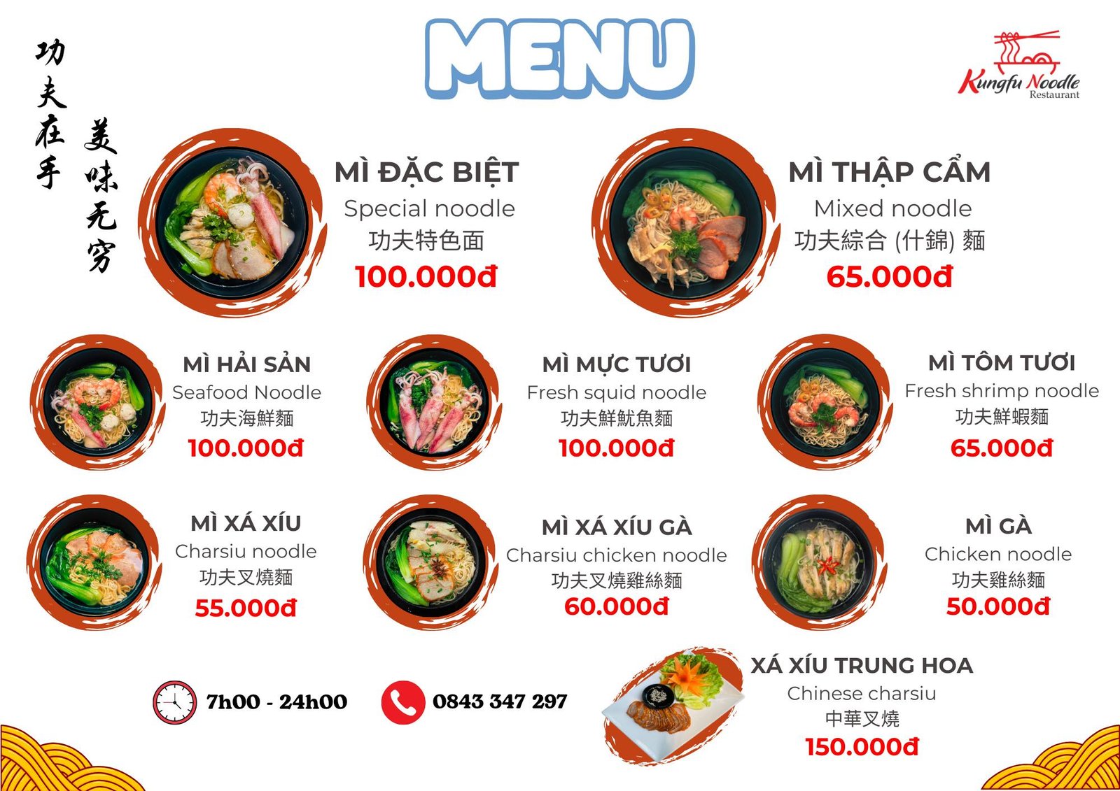 Please see the menu of Kungfu Noodle Restaurant at Sunset Town Phu Quoc on the pictures attached below: