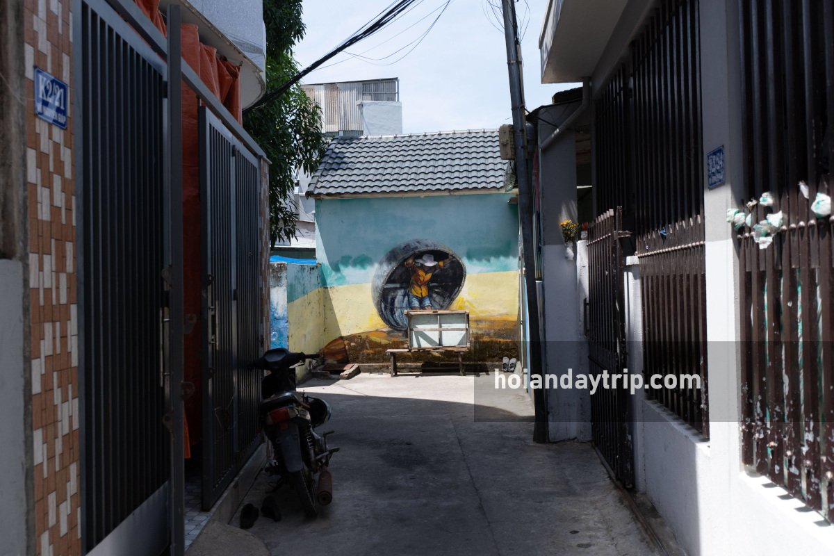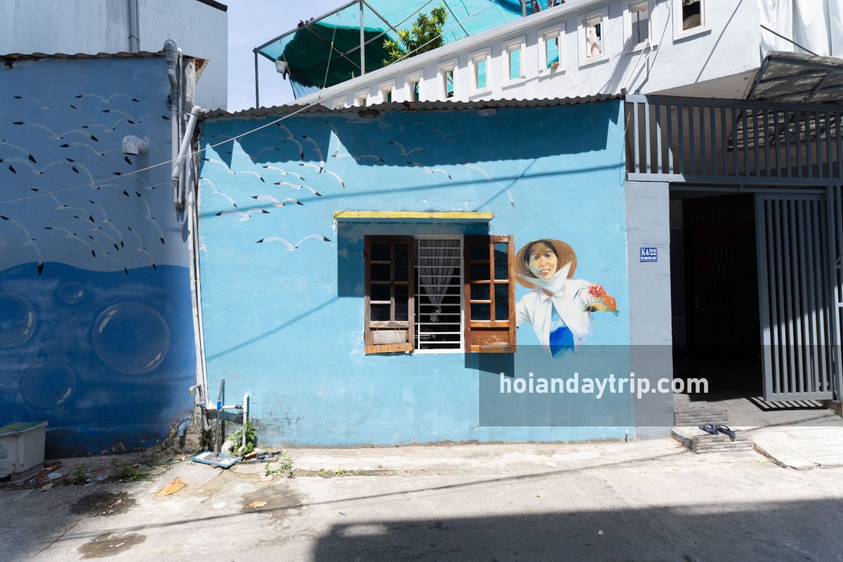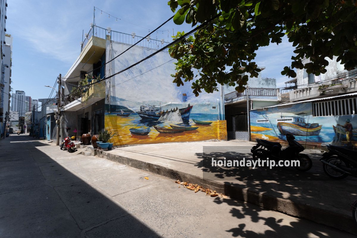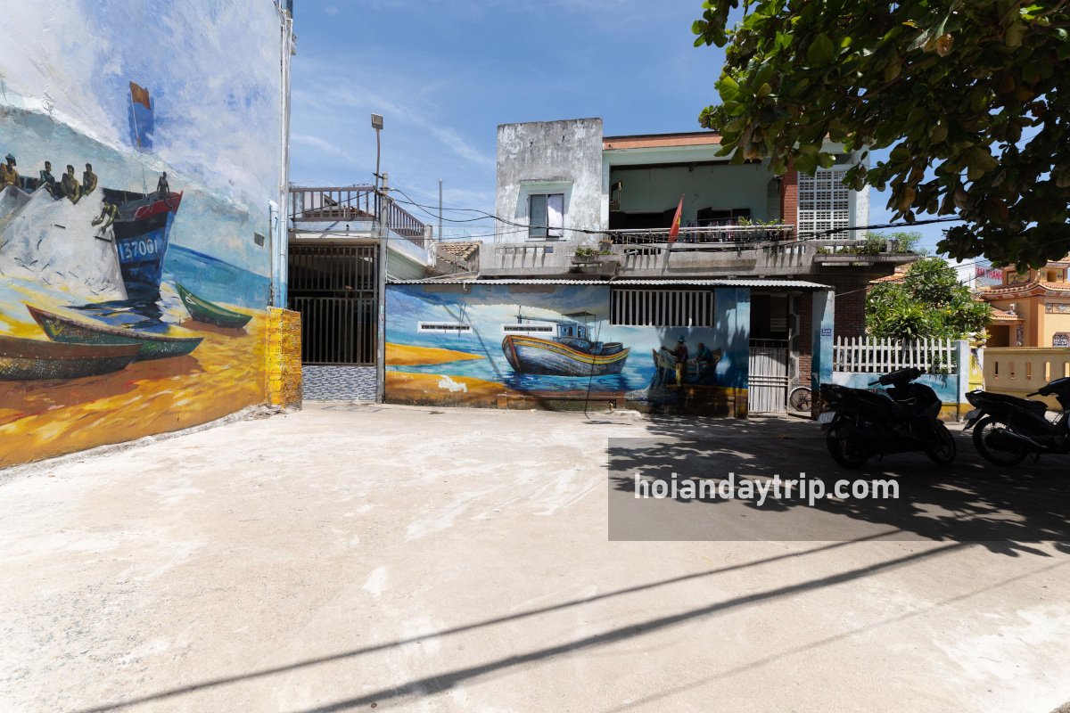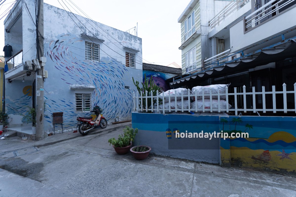 About the exact location, Man Thai Mural Village is in alleyways next to the Whale Temple of Man Thai Fishing Village at 2-4 Vo Nguyen Giap Street. It’s close to the crossroads of Vo Nguyen Giap Street and Nguyen Huu Chuong Street, and Man Thai Beach, a lesser known beach with a view to Vietnam’s tallest Lady Buddha statue.