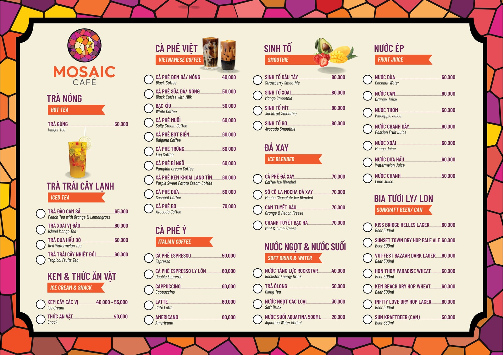 At Mosaic Cafe Sunset Town Phu Quoc, visitors will see these drinks: Vietnamese black coffee (40,000 VND), Vietnamese black coffee with condensed milk, white coffee (50,000 VND), salt coffee, egg coffee, pumpkin coffee, coconut milk coffee, purple sweet potato (60,000 VND), avocado coffee (70,000 VND), ginger tea (50,000 VND), Italian coffee (espresso, cappuccino, latte), Americano (50,000-60,000 VND), smoothies (60,000 VND), ice blended drinks (70,000 VND), soft drinks (30,000-40,000 VND), juices and coconut (50,000-60,000 VND), SunKraft beer (7 flavors, 50-60,000 VND),…