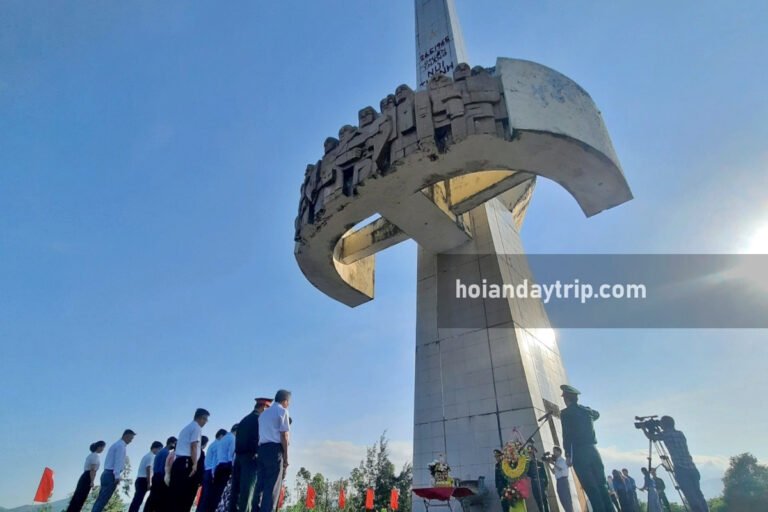 The Nui Thanh Victory Monument, a national historical revolutionary relic, is located on Phu Hue hill in Tam Nghia commune, Nui Thanh district, Quảng Nam province. It commemorates the decisive Nui Thanh victory on May 26, 1965, which was a pivotal early battle against US forces during the Vietnam War. Standing 28 meters tall, the monument is modeled after the hammer and sickle symbol and features a bronze-plated relief depicting the battle’s participants. See more details