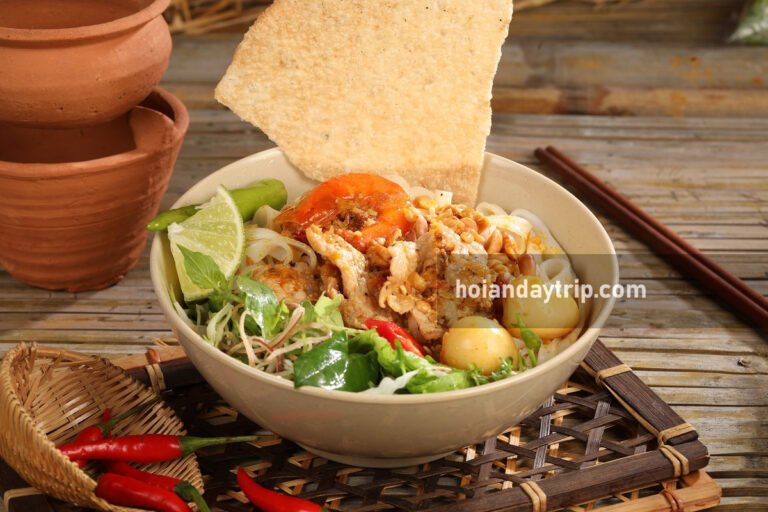 Your lunch will be a local specialty food called ‘Mi Quang’ (or Quang Noodles). It’s a noodle dish that is made of soft rice noodles, chicken and broth. Raw vegetables, fresh herbs and crispy grilled rice paper are served as side dishes. See more details