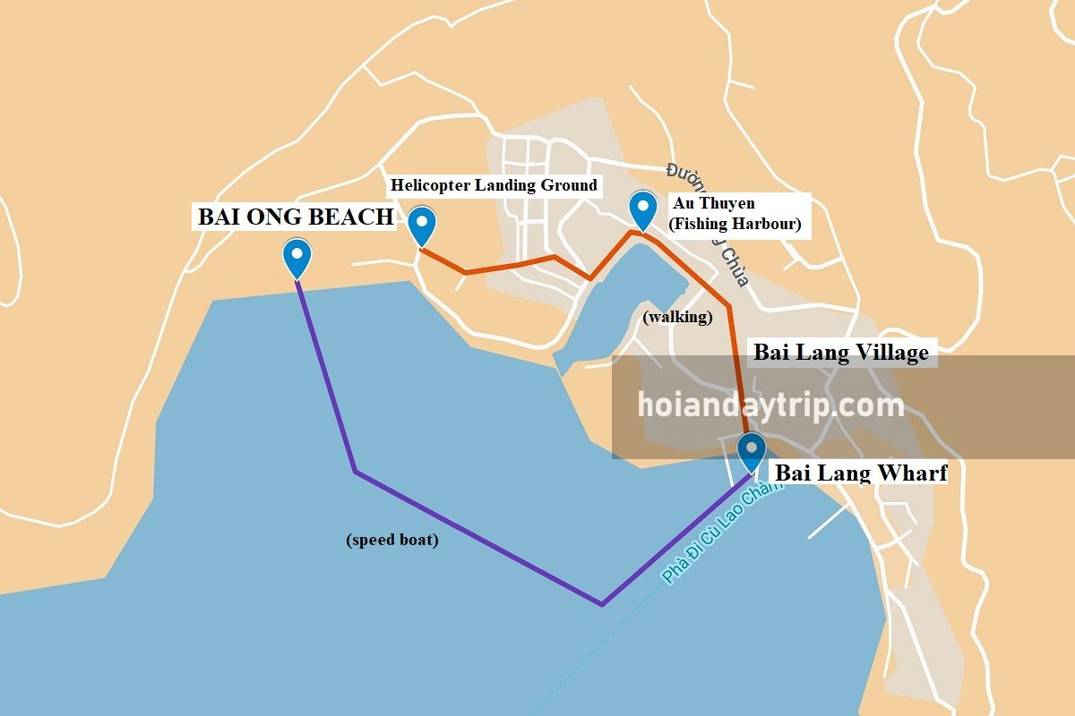 - Walking: After reaching the island, the distance from the wharf in Bai Lang to Ong Beach is less than 1 kilometer, so getting there by foot is absolutely feasible (if you visit without a tour). Search the location of the helicopter landing ground or ask the locals. The beach is not far away from that place.