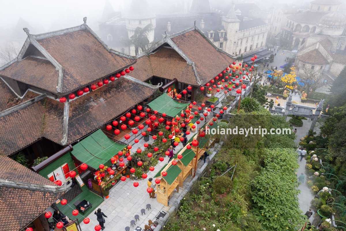 If take the cable car from Hoi An Station, the arrival station will be Marseille Station. From here, visitors should go to Golden Hands Bridge first, flower gardens, giant Buddha statue and Linh Ung Pagoda. After that, go to Bordeaux Station to take the cable to French Village. From the arrival station – Louvre Station, reach the Saint Denis Church and then follow the path to the left of the church. At Viet Restaurant, climb stairs to Chua Mountain Peak and the Rain Sheltering Teahouse lies on the right hand side.