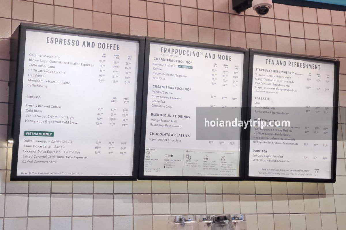 – Frappuccino & more: coconut espresso (90,000 to 114,000 VND), coffee frappuccino (100,000 to 124,000 VND), caramel/mocha/espresso (110,000 to 134,000 VND), java chip (120,000 to 144,000 VND)