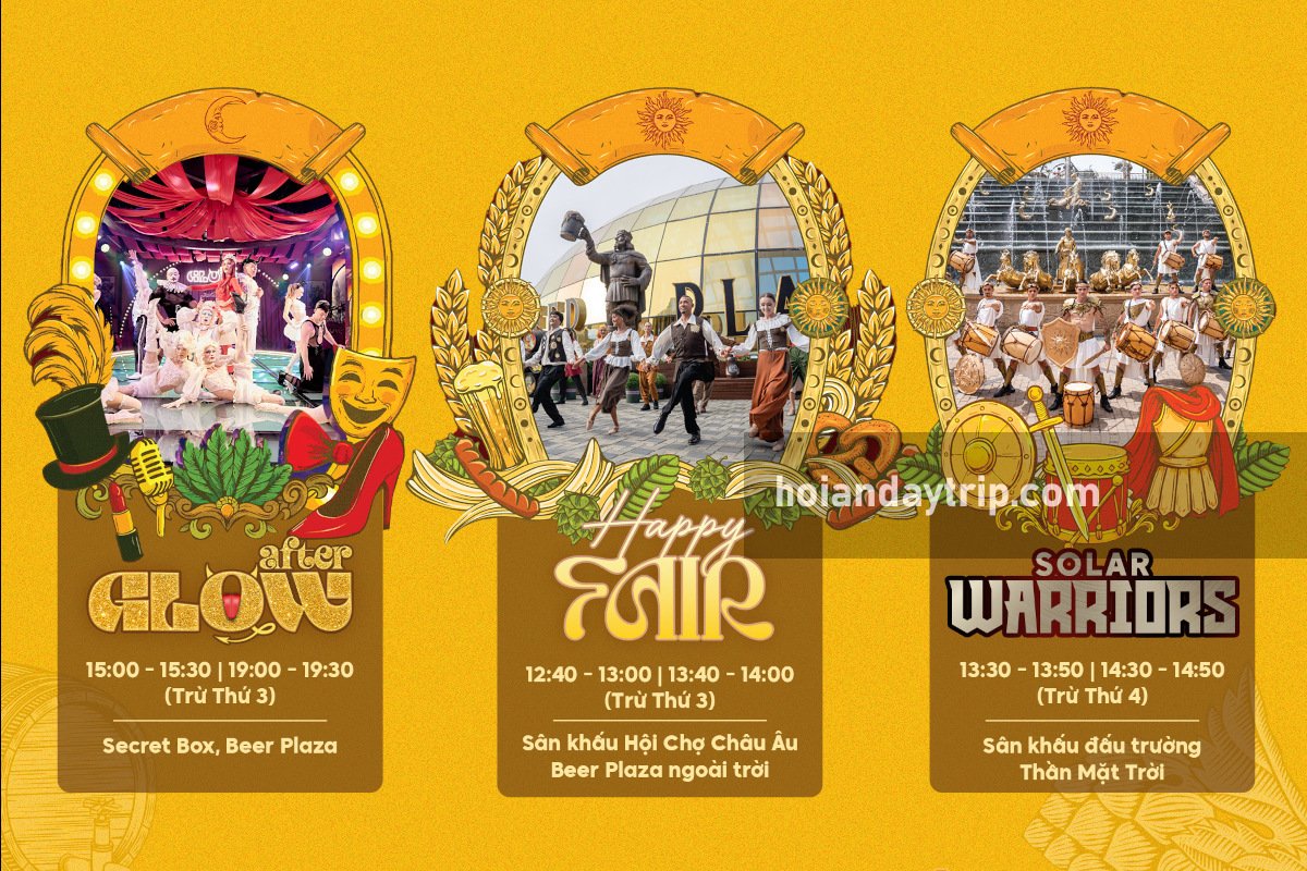 Don’t forget watching these shows throughout the day in Ba Na Hills Sun Craft Beer Festival: Happy Fair at Beer Plaza (12:40-1:00 pm, 1:40-2:00 pm), Solar Warriors (1:30-1:50 pm, 2:30-2:50 pm), and After Glow (3:00-3:30 pm, 7:00-7:30 pm), the first cabaret show in Da Nang (see more details).