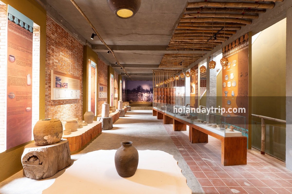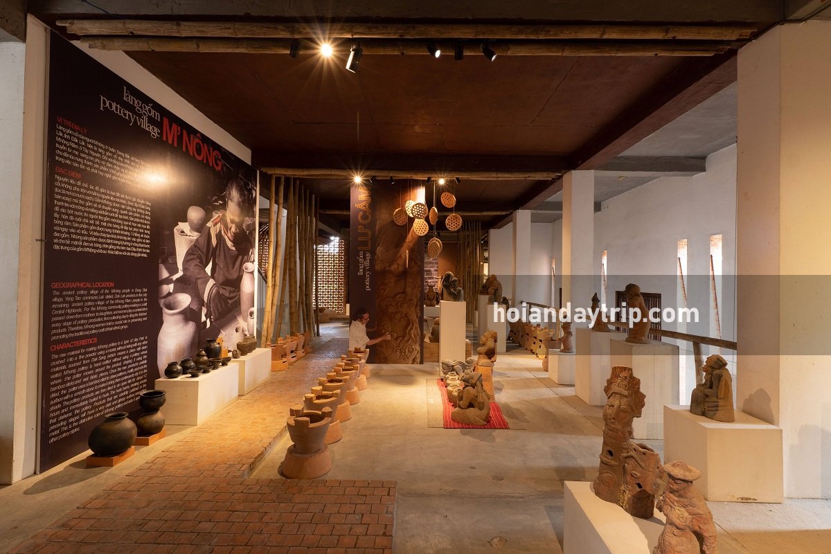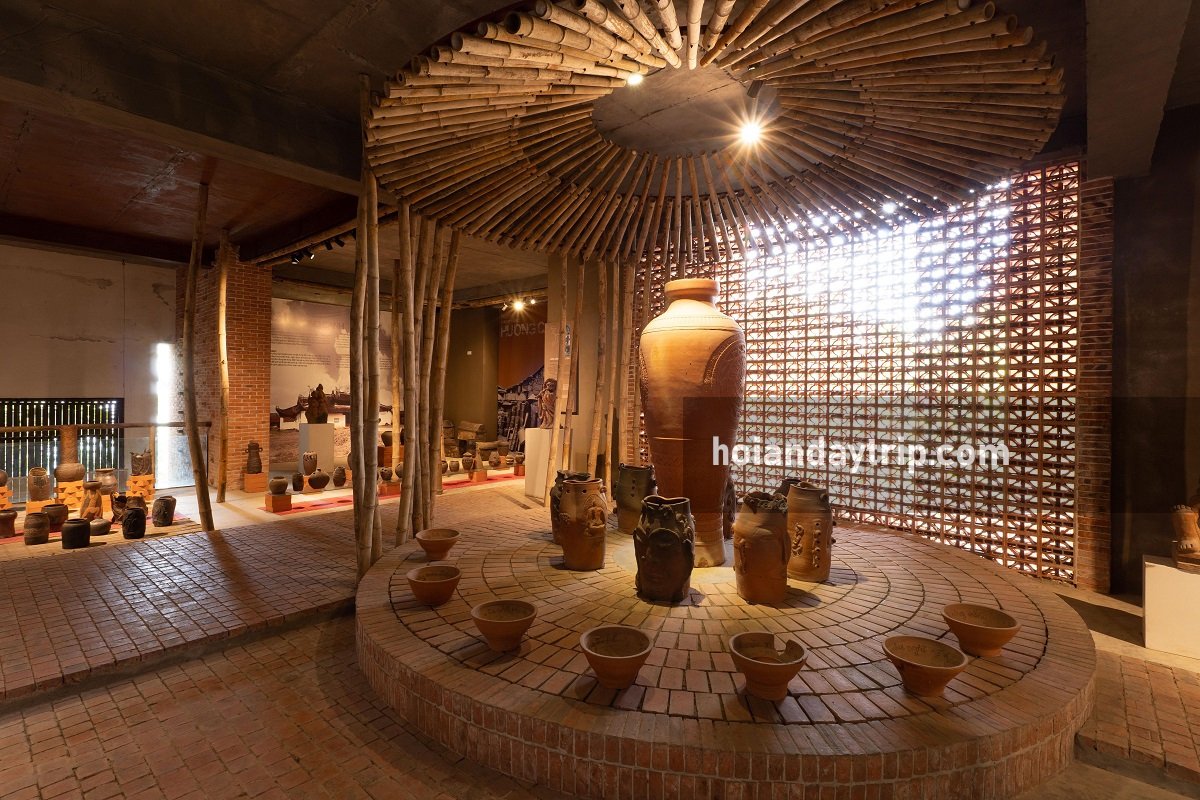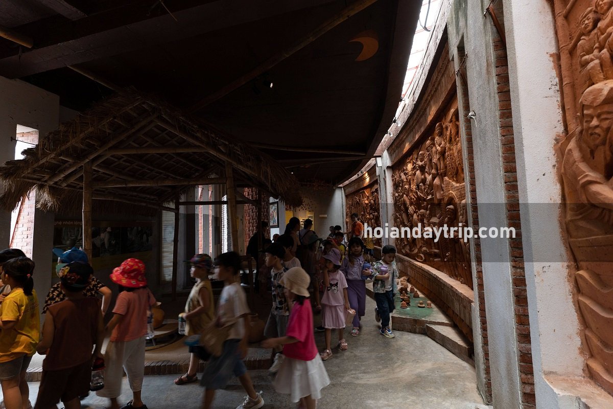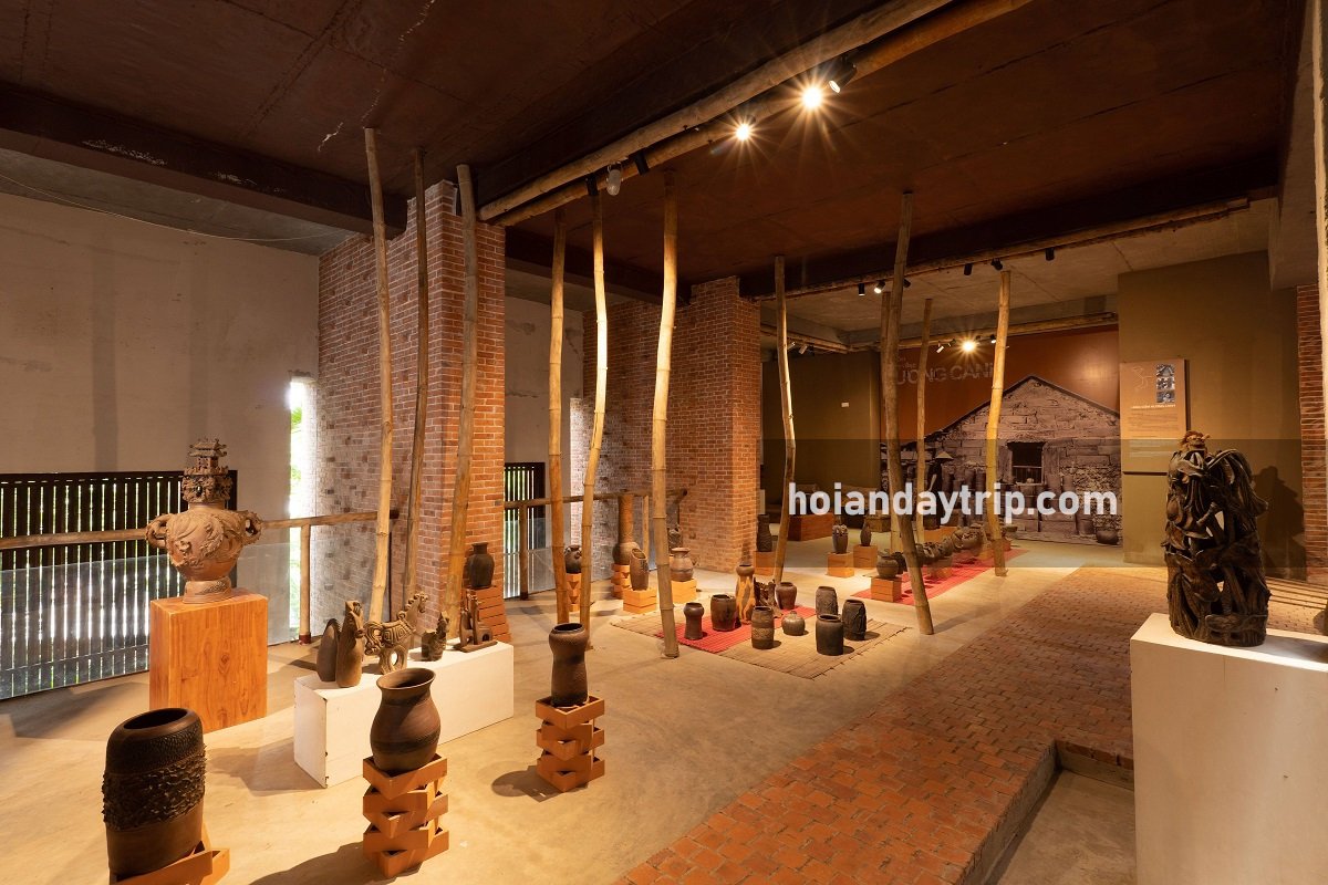 Two major buildings of Thanh Ha Terracotta Park portray two different types of pottery kiln in the village: ‘opening’ and ‘closing’ kilns. On the right hand side, there is the ‘opening kiln’ which has three levels. The first level is used to exhibit paintings and clay sculptures from Vietnamese artists. On the second level, visitors have the chance to learn about traditional pottery villages across Vietnam, and their long-standing pottery making. Information about their history and typical style are introduced with detail. In the northern region, Huong Canh Pottery Village is the representative, and Phuoc Tich Pottery Village represents the central region. Down the south, the pottery village of M’nong and Cham people, are most featured. Especially, the art of pottery making of the Chams was recognized by Unesco to be world’s intangible cultural heritage in 2022. On the highest level, the exhibition of pottery making of Sa Huynh and Champa cultures provides insight into the disappearance.