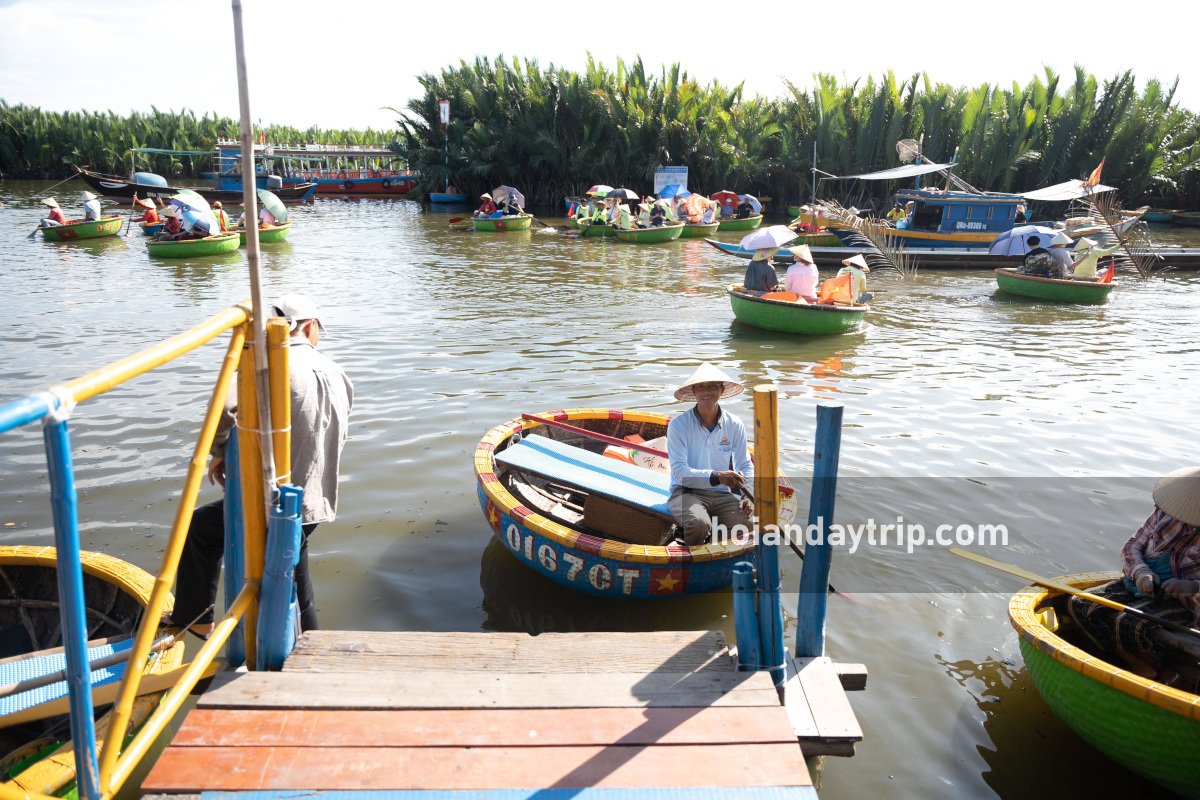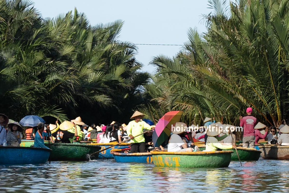 Along the riverside road of Van Lang Fishing Village, visitors will see plenty of basket boats (or round boat, circle boat) to embark on a trip to discover Bay Mau Water Coconut Forest. This is the largest nipa palm forest in the central Vietnam region. It served as the hiding place of Vietcong communists during the American war (1960s and 1970s). Within it, there is a dense network of small canals which flow into the Thu Bon River or the sea later. By that, the waterways are under tidal influence.
